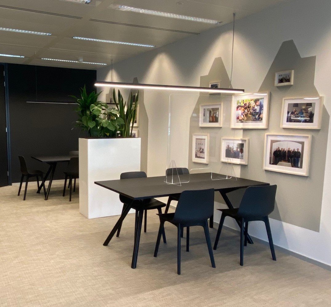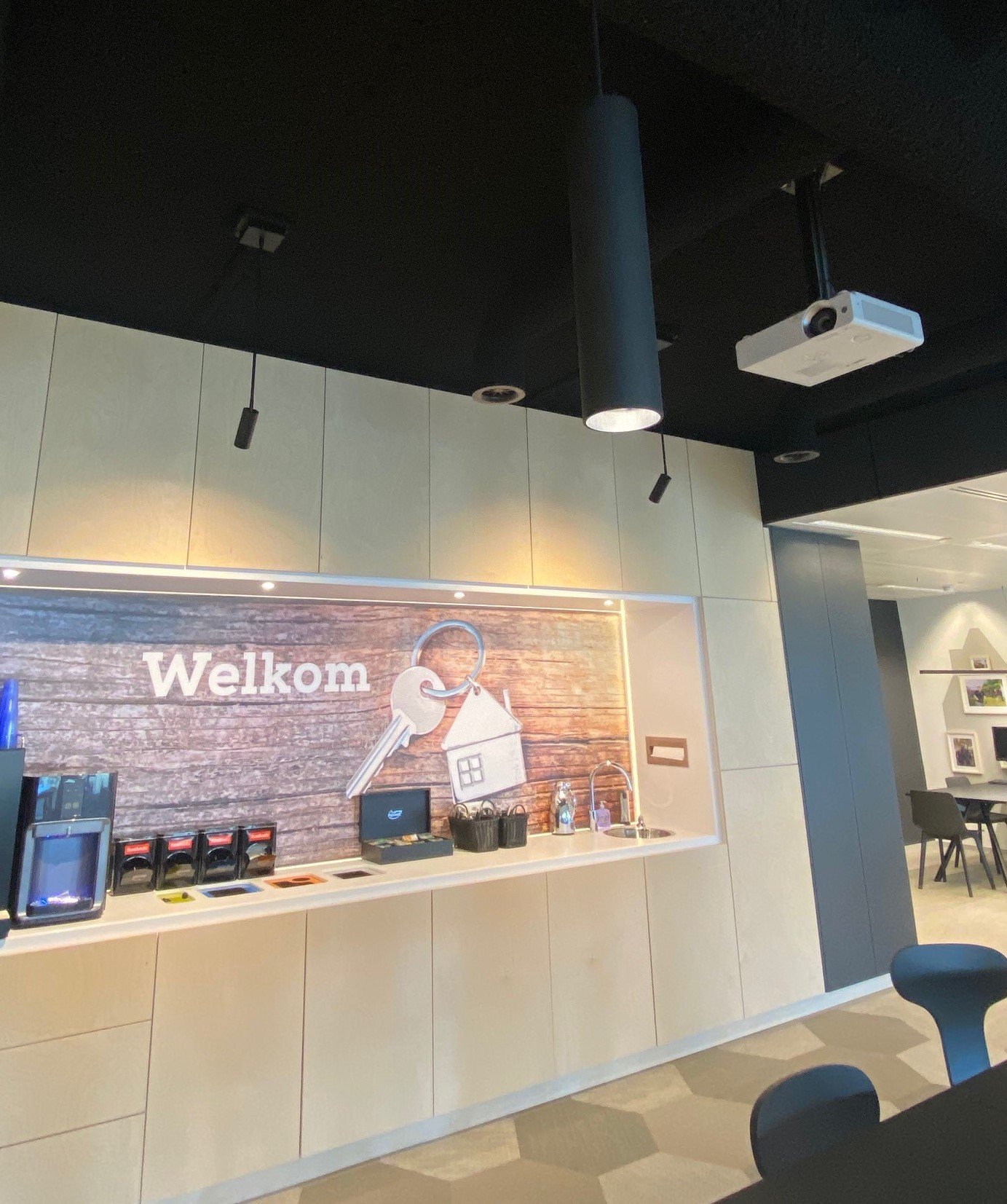 Hees Lights & Living heeft de verlichting verzorgd, waaronder LED armaturen voor de werkplekken en maatwerkoplossingen voor de vergaderruimtes en de entree. Ook was er een hoger, akoestisch plafond in de pantry’s dat een specifieke montage vereiste. Daar was geen standaard oplossing voor, dus Chantal Hees loste het op met maatwerk spots, welke binnen het projectbudget worden uitgewerkt.