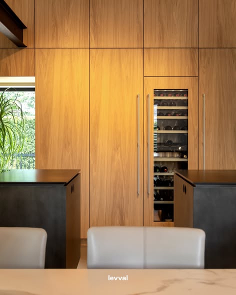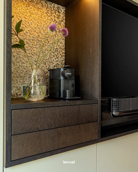 De keuken, uitgerust met Gaggenau apparatuur, vormt een praktisch en esthetisch middelpunt. Natuurlijk licht wordt aangevuld met zorgvuldig geplaatste verlichting. Sfeerverlichting van Hees Lights & Living en functionele accenten van Masterlight zorgen voor diepte en benadrukken de architectonische lijnen.