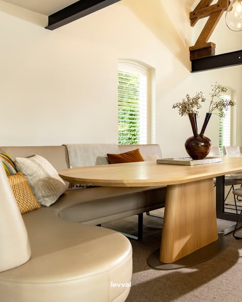 De ruimte is ontworpen om in te leven. Ronde vormen zorgen voor ontspanning, terwijl strakke lijnen helderheid en structuur bieden. Van rustige avonden op de zitbank tot diners met de hele familie aan de op maat gemaakte tafel met stoelen van Leolux.