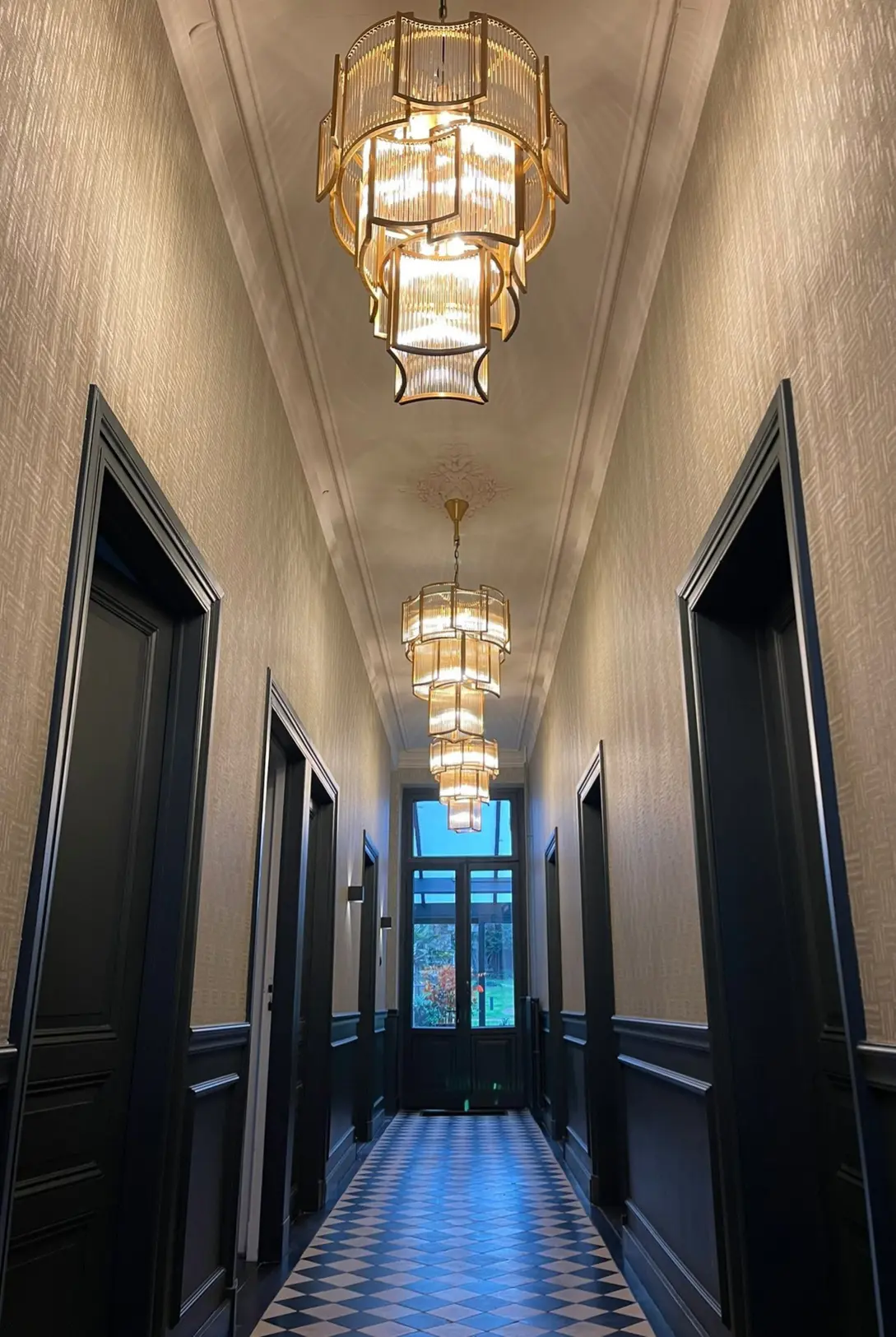 Villa V in Valkenburg ademt historie en stijl. Om deze bijzondere sfeer te versterken, hebben wij gekozen voor verlichting die past bij het karakter van de villa. Geen moderne spots of strakke armaturen, maar eyecatchers die bijdragen aan de warme, luxe uitstraling. In de hal schitteren statige kroonluchters, terwijl zorgvuldig gekozen statement pieces de intimiteit van de kamers benadrukken. De verlichting is niet alleen functioneel, maar ook een essentieel onderdeel van de beleving, waardoor elk detail van het stijlvolle interieur perfect tot zijn recht komt.